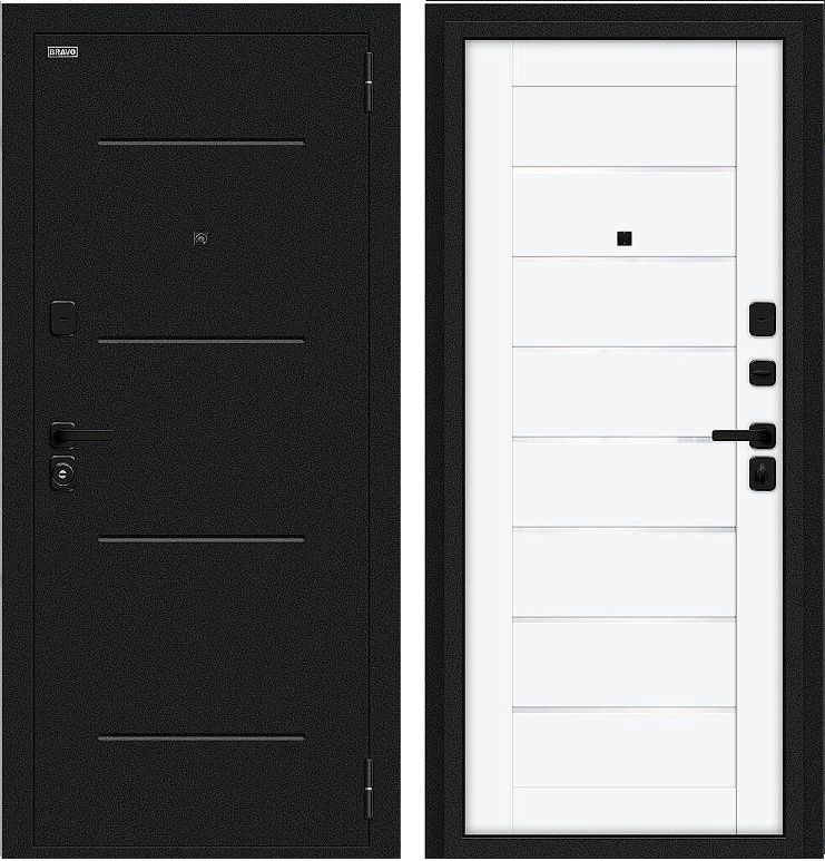 Надежная входная Дверь Браво Техно/SBlack Букле черное/White Silk премиум класса по цене 34 707 руб. Большая толщина стали защитит от проникновения в ваш дом, квартиру или коттедж. Используется очень качественная фурнитура: замки, цилиндры, ручки, защелки. Покрытие и отделка двери изготовлено под внимательным контролем производителя. Дверь имеет долгий срок службы и гарантию.
